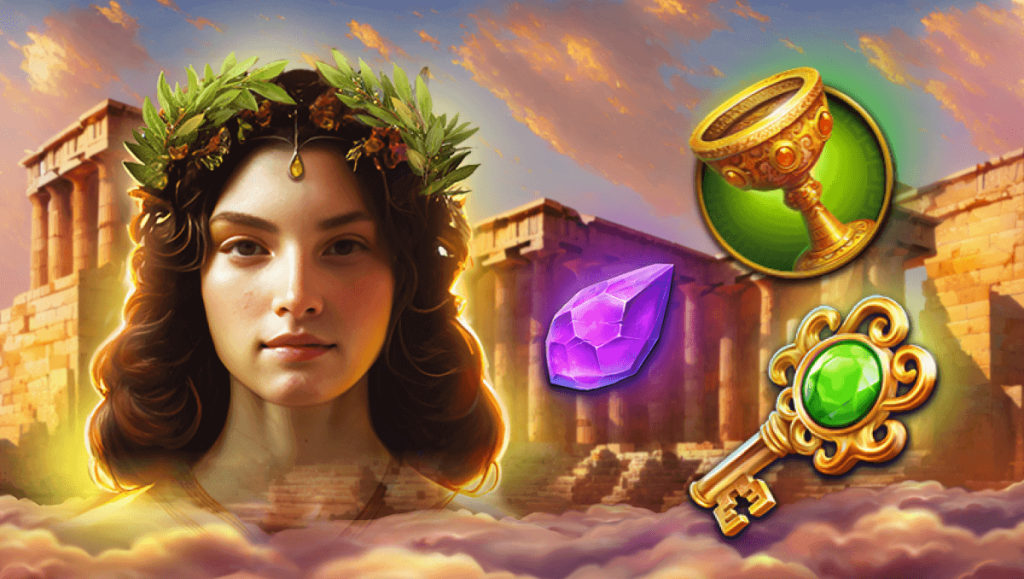 На фоне игры Вы увидите скалы, морской залив и каменные колонны древних храмов на холме. Во время бонусных раундов Вы легко можете оказаться в одной из цветных комнат храма или даже взлететь выше облаков. В качестве главных символов используются изображения богов и богинь, священные кубки и драгоценности.