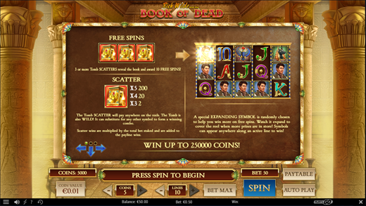You can confirm the result in the Paytable. As shown in the earlier screenshot of the first Paytable page, the Tomb symbol is wild, so here it is used as a fourth 10 in the winning line.