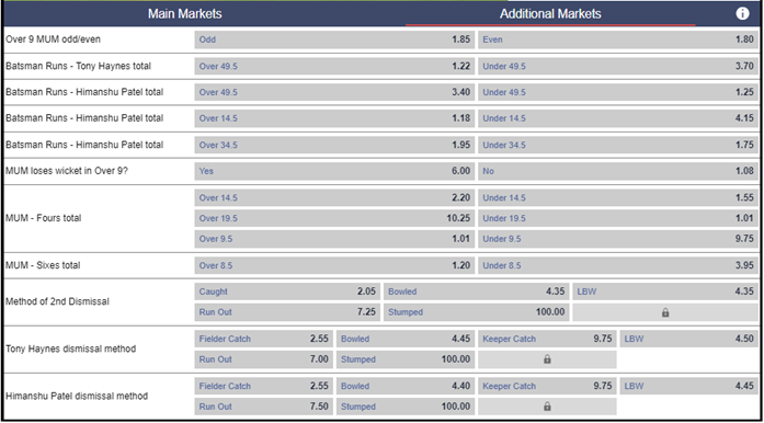 On the additional markets page, you can bet, amongst other things, on the number of runs each batsman will score, their method of dismissal and the number of fours and sixes in the innings.