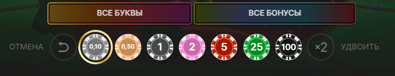 Просто укажите сумму ставки и нажмите «Все буквы», чтобы сделать ставку на все 12 букв, или «Все бонусы», чтобы поставить на все бонусы сразу.