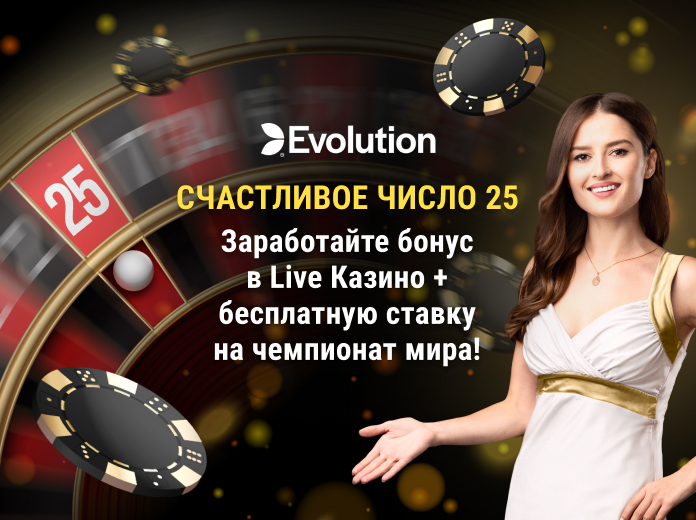Получите бонус € 50 в Live Казино и бесплатную ставку € 25 на финал чемпионата мира по футболу! Чтобы принять участие в акции «Счастливое число 25», сделайте 5 прямых выигрышных ставок на число 25 на указанных столах рулетки от Evolution: