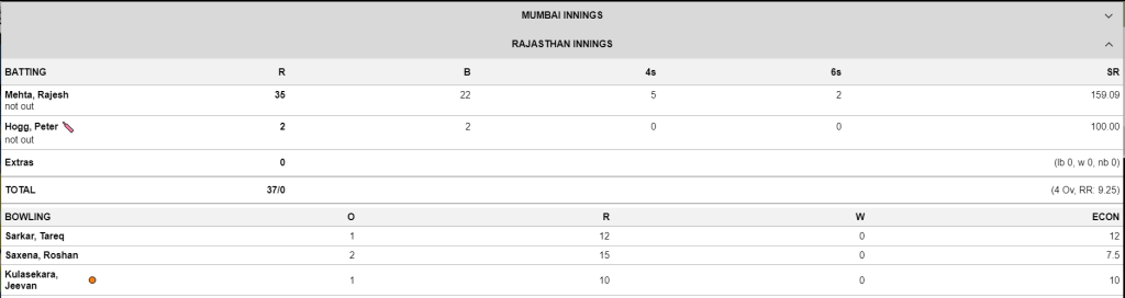 Текущий счет обновляется по ходу матча после каждого изменения. Вы также видите на экране имена отбивающих бэтсменов и подающих боулеров.