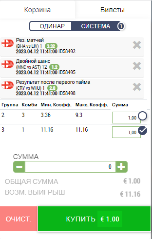 Нажмите на ячейки с коэффициентами, чтобы добавить выбранные исходы в купон. В купоне появятся варианты одиночных и сложных ставок, доступных для выбранных Вами исходов. Нажмите на кнопку «Купить», чтобы сделать ставку.