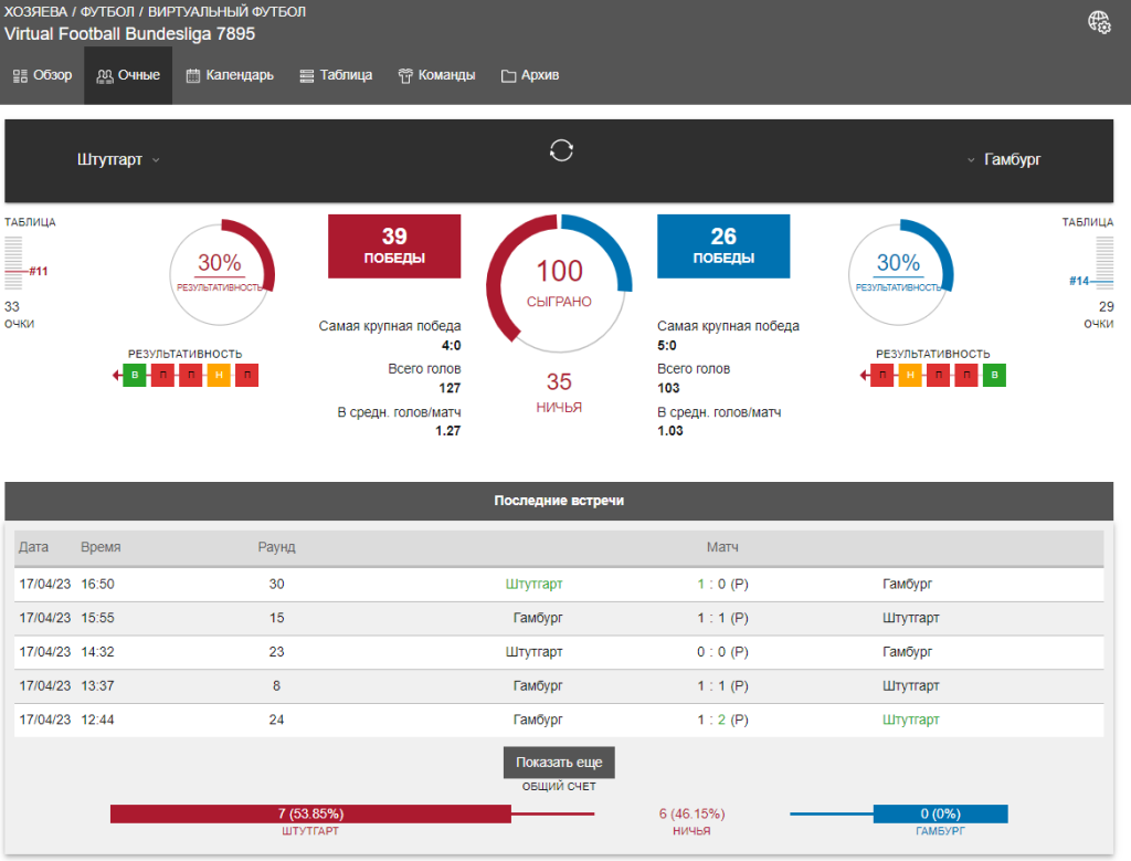 В верхней части страницы отображаются список предстоящих матчей, статистика предыдущих встреч и турнирная таблица.
