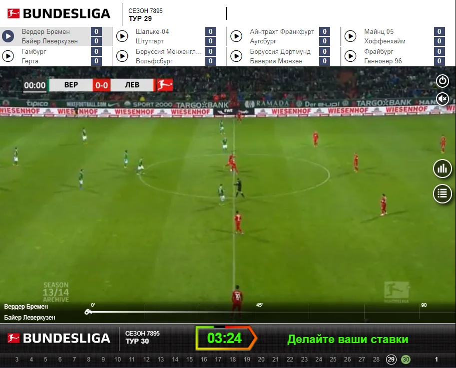 Эта уникальная игра от Betradar предлагает Вам погрузиться в атмосферу настоящего футбольного матча благодаря качественной графике и видеофрагментам из настоящих матчей немецкой Бундеслиги.