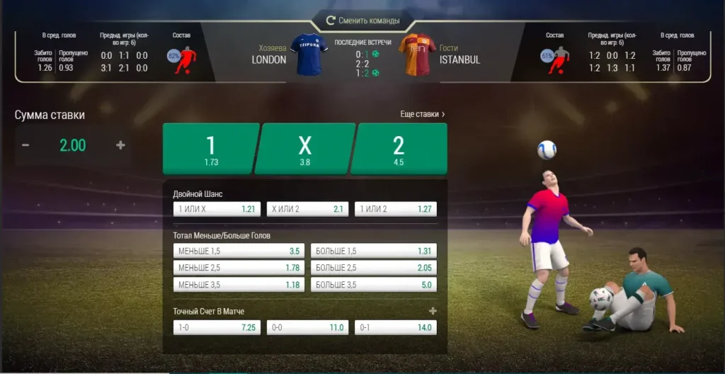 В этой игре от Leap Gaming Вы можете делать ставки на товарищеские матчи футбольных клубов или же выбрать команды случайным образом. Заменить пары соперников можно с помощью кнопки «Смена команды» в верхней части экрана. Матч не начнется без Вашего участия, а значит есть время внимательно изучить статистику и сделать ставки.